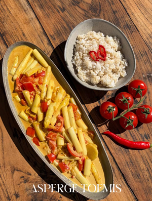 • 500 gr witte asperges, geschild, kontje verwijderd en in stukken gesneden