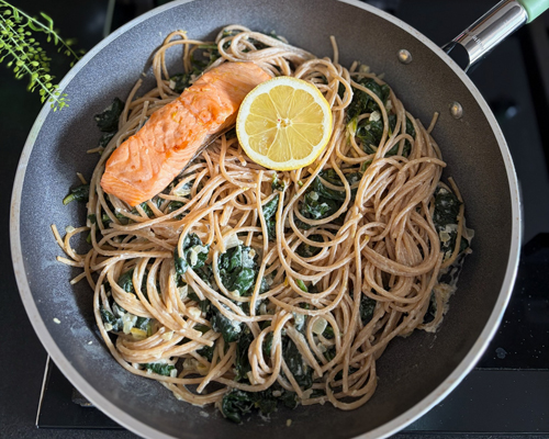 Een romige en toch frisse spaghetti met zalm en spinazie, voedzaam en zo op tafel