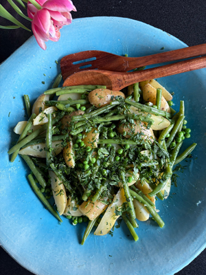 Deze frisse aardappelsalade met boontjes, erwtjes en verse kruiden is alles wat je nodig hebt op zo’n heerlijke zonnige dag
