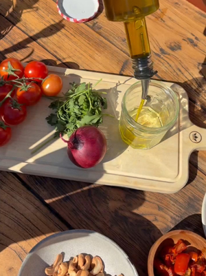 - Voeg alle ingrediënten voor de dressing samen in een maatbeker, meng goed door en zet apart
