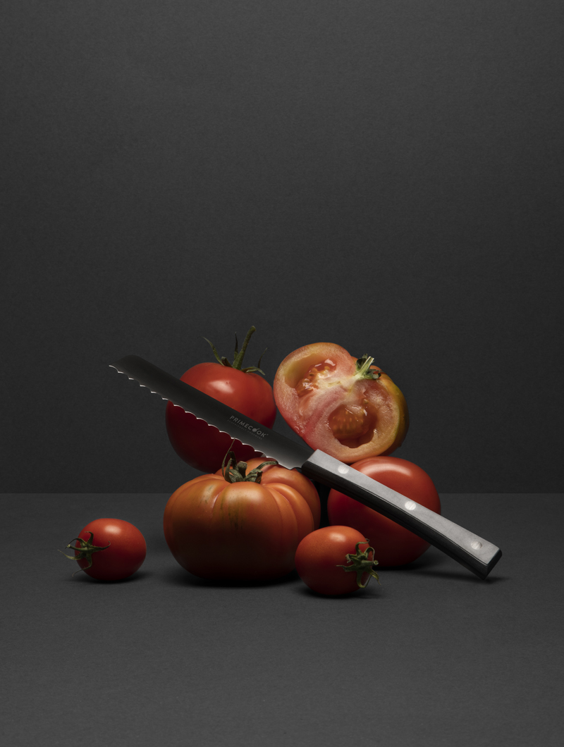 Een tomatenmes is een klein gekarteld mes met een recht lemmet van 12 cm. Het snijvlak is scherp. Het wordt gebruikt om groenten en fruit te snijden. Met name producten met een taaie schil en zachte binnenkant, zoals tomaten, moeten met het juiste mes worden gesneden om te voorkomen dat de vorm en structuur wordt vernield en het sap eruit loopt. Dus ook voor nectarines, perziken en druiven is dit mes de goede keuze. Hiermee verandert de snijplank niet in een slagveld en snijdt u mooie egale plakken.