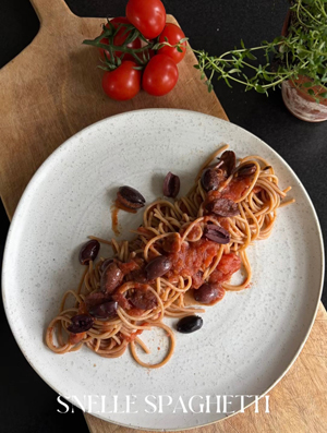 - Voeg als laatste de spaghetti toe, breng het geheel op smaak met zout en versgemalen peper, garneer evt met extra gehalveerde olijfjes en smakelijk!